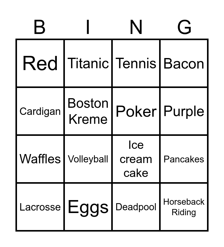 This bingo card has 20 words: Pancakes, Blue, Tennis, Rubiks Cube, Lacrosse, Cardigan, Eggs, Red, Waffles, Titanic, Volleyball, Ice cream cake, Boston Kreme, Horseback Riding, Poker, Candyland, Purple, Bacon, Deadpool and Sorry.
