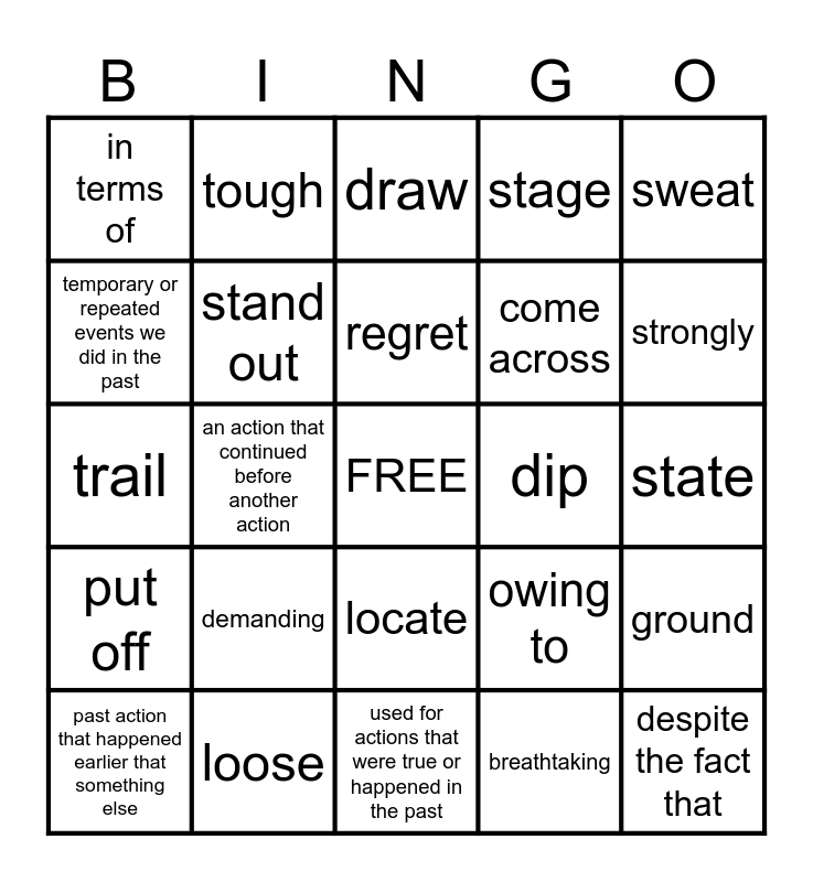 This bingo card has a free space and 24 words: demanding, loose, regret, past action that happened earlier that something else, sweat, in terms of, temporary or repeated events we did in the past, tough, dip, locate, come across, trail, owing to, ground, stand out, breathtaking, state, draw, strongly, an action that continued before another action, despite the fact that, put off, stage and used for actions that were true or happened in the past.