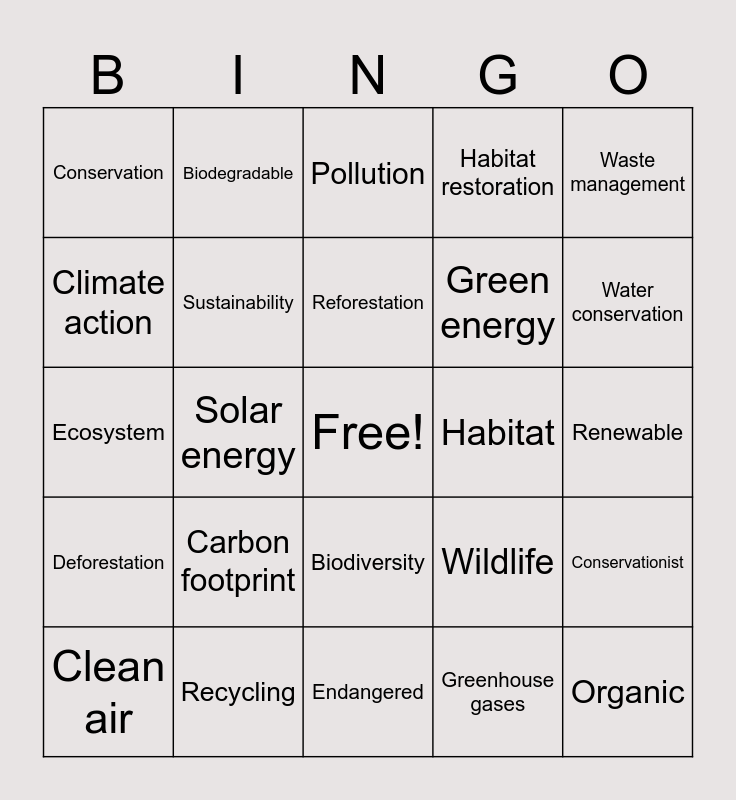 This bingo card has a free space and 30 words: Recycling, Compost, Solar energy, Wind turbine, Conservation, Pollution, Sustainability, Biodiversity, Habitat, Endangered, Renewable, Organic, Greenhouse gases, Eco-friendly, Water conservation, Climate change, Wildlife, Deforestation, Carbon footprint, Waste management, Ecosystem, Renewable resources, Biodegradable, Green energy, Climate action, Habitat restoration, Conservationist, Clean air, Reforestation and Plastic waste.