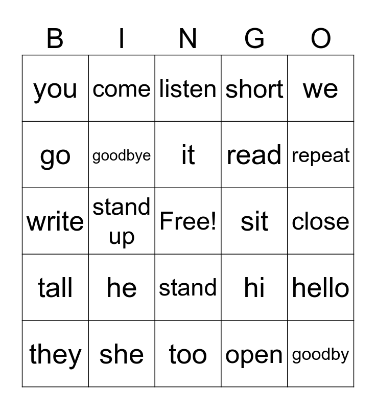 This bingo card has a free space and 24 words: he, she, it, they, we, you, go, come, sit, stand, read, write, hi, hello, goodbye, open, close, listen, repeat, stand up, goodby, tall, short and too.