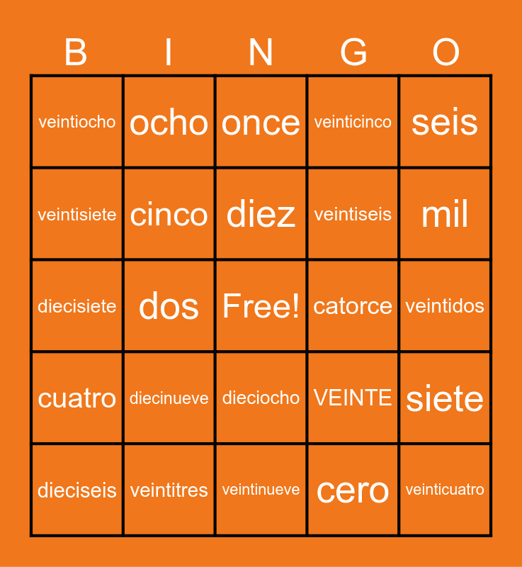 This bingo card has a free space and 32 words: cero, uno, dos, tres, cuatro, cinco, seis, siete, ocho, nueve, diez, once, doce, trece, catorce, quince, dieciseis, diecisiete, dieciocho, diecinueve, VEINTE, veintiuno, veintidos, veintitres, veinticuatro, veinticinco, veintiseis, veintisiete, veintiocho, veintinueve, cien and mil.