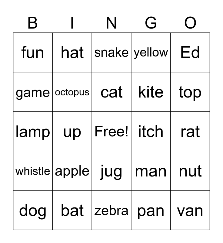 This bingo card has a free space and 24 words: apple, bat, cat, dog, Ed, fun, game, hat, itch, jug, kite, lamp, man, nut, octopus, pan, rat, snake, top, up, van, whistle, yellow and zebra.