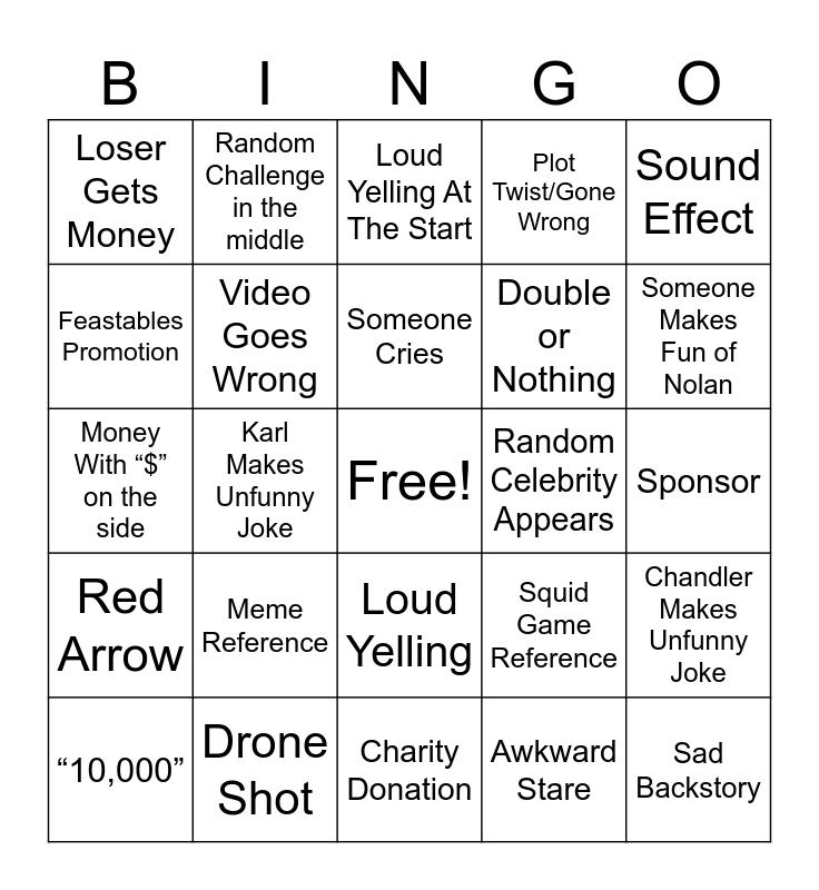 This bingo card has a free space and 24 words: Meme Reference, Drone Shot, Someone Cries, “10,000”, Sound Effect, Loser Gets Money, Feastables Promotion, Random Challenge in the middle, Random Celebrity Appears, Loud Yelling, Double or Nothing, Money With “$” on the side, Squid Game Reference, Chandler Makes Unfunny Joke, Video Goes Wrong, Awkward Stare, Sponsor, Loud Yelling At The Start, Someone Makes Fun of Nolan, Karl Makes Unfunny Joke, Sad Backstory, Red Arrow, Plot Twist/Gone Wrong and Charity Donation.