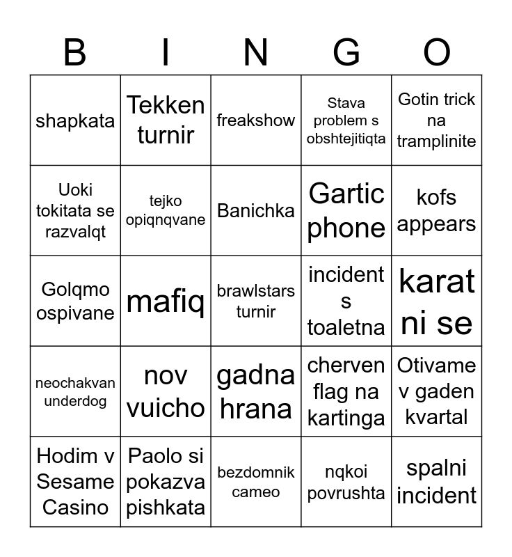 This bingo card has 30 words: Paolo si pokazva pishkata, incident s hrana, mafiq, movie night, shapkata, freakshow, tejko opiqnqvane, gadna hrana, incident s toaletna, bezdomnik cameo, karat ni se, brawlstars turnir, nqkoi povrushta, spalni incident, kofs appears, nqkoi se gubi/ izchezva, cherven flag na kartinga, neochakvan underdog, nov vuicho, Gotin trick na tramplinite, Golqmo ospivane, Sreshta sus celebrity, Tekken turnir, Gartic phone, Uoki tokitata se razvalqt, Stava problem s obshtejitiqta, Otivame v gaden kvartal, Hodim v Sesame Casino, Banichka and Cosplayer na ulicata.
