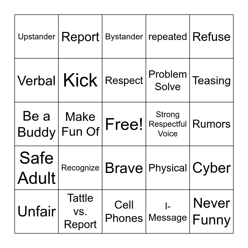This bingo card has a free space and 33 words: Kind Words, One-Sided, Make Fun Of, I don't like that. Please stop!, Safe Adult, Kick, Refuse, Unfair, Report, LOFTLO, Respect, Bystander, Online Gaming, Social, Strong Respectful Voice, Teasing, Tattle vs. Report, Be a Buddy, Recognize, Physical, Brave, Hit, Upstander, Rumors, Cell Phones, Never Funny, repeated, Problem Solve, Verbal, Cyber, On Purpose, I-Message and Include Everyone.