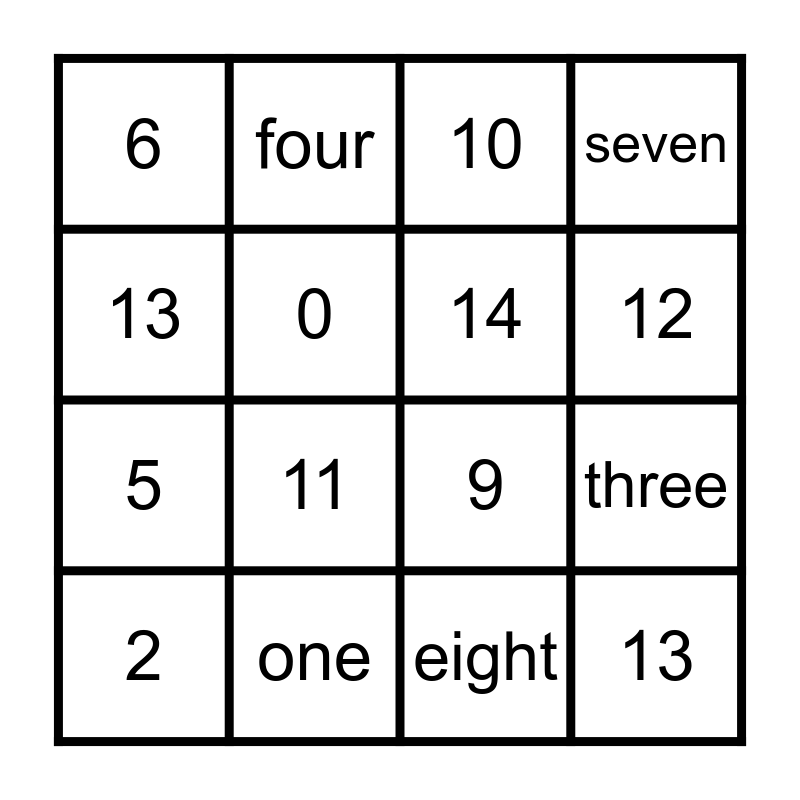 This bingo card has 16 words: one, three, 10, 6, 5, four, 9, eight, 13, 0, 2, seven, 11, 12, 14 and 13.