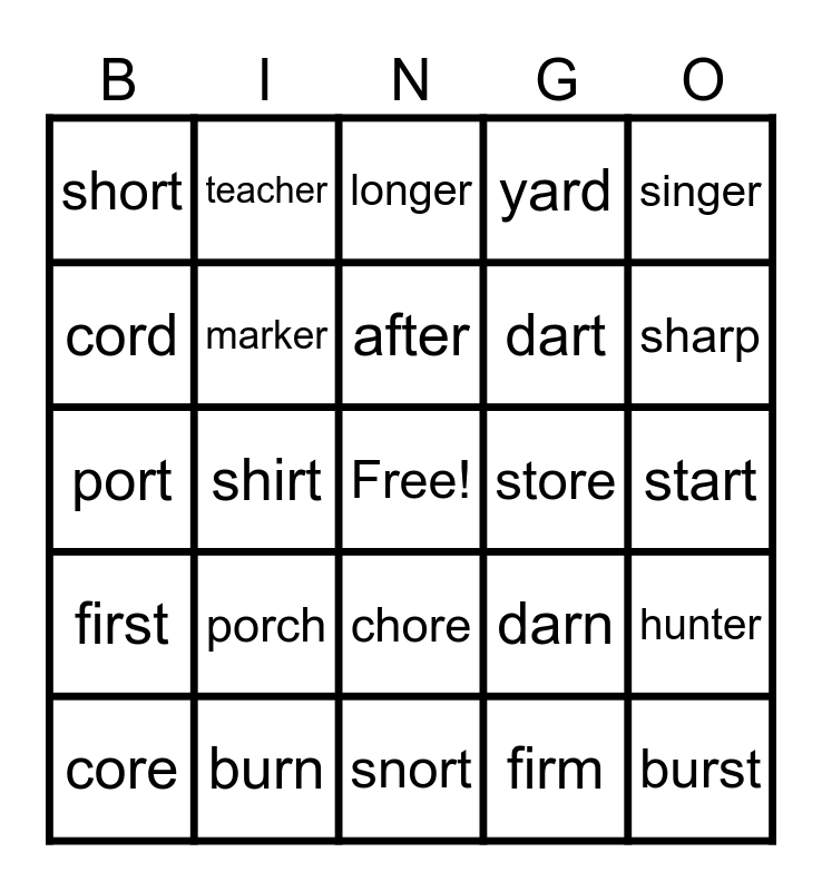 This bingo card has a free space and 32 words: firm, farm, shirt, her, first, marker, singer, hunter, teacher, runner, after, longer, shorter, shore, store, bore, core, port, chore, porch, darn, tar, start, burn, burst, yard, dart, cord, short, snort, for and sharp.