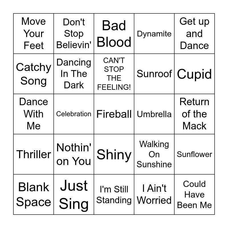 This bingo card has 74 words: 24K Magic, A Sky Full of Stars, Bad Blood, Barbie Dreams, Be Okay, Best Day Ever, Better Place, Better When I'm Dancin', Blank Space, Butter, Call Me Maybe, Calm Down, CAN'T STOP THE FEELING!, Catchy Song, Celebrate!, Celebration, Could Have Been Me, Cupid, Dance Through the Day, Dance With Me, Dancing In The Dark, Don't Stop Believin', Dynamite, Everybody Wants To Rule The World, Fireball, Firework, Flowers, Footloose, Free Fallin', Fun, Fun, Fun, Get up and Dance, Ghostbusters, Good Mood, Happy, Havana, I Ain't Worried, I Am Moana, I Gotta Feeling, I Like To Move It, I Wanna Dance with Somebody, I'm Still Standing, Just Sing, Levitating, Life is a Highway, Lil Boo Thang, Move Your Feet, Nobody Like U, Nothin' on You, Nothing's Gonna Stop Us Now, On Top Of The World, Peaches, Rain On Me, Return of the Mack, Rewrite The Stars, Set It All Free, Shake It Off, Shiny, Shut up and Dance With Me, Stereo Madness, Sunflower, Sunroof, Take You To Rio, Thriller, Try Everything, Umbrella, Un Poco Loco, Uptown Funk, Walk the Dinosaur, Walking On Sunshine, When Can I See You Again, Who Let The Dogs Out, You Make My Dreams, You're Welcome and You've Got a Friend in Me.
