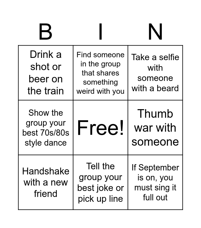 This bingo card has a free space and 8 words: Thumb war with someone, Take a selfie with someone with a beard, Find someone in the group that shares something weird with you, Handshake with a new friend, Drink a shot or beer on the train, If September is on, you must sing it full out, Show the group your best 70s/80s style dance and Tell the group your best joke or pick up line.