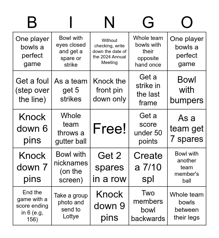 This bingo card has a free space and 27 words: Create a 7/10 spl, Get a double (2 strikes back to back), Get a strike in the last frame, Knock down 9 pins, Get a foul (step over the line), Without checking, write down the date of the 2024 Annual Meeting, Bowl with eyes closed and get a spare or strike, Knock down 7 pins, Get a score under 50 points, Bowl with another team member's ball, Knock down 6 pins, Whole team bowls with their opposite hand once, End the game with a score ending in 6 (e.g, 156), Take a group photo and send to Lottye, Bowl with bumpers, Give a compliment to another team, As a team get 5 strikes, Knock the front pin down only, Bowl with nicknames (on the screen), One player bowls a perfect game, As a team get 7 spares, Two members bowl backwards, Whole team throws a gutter ball, Whole team bowls between their legs, Get 2 spares in a row, One player bowls a perfect game and One member bowls a turkey (3 strikes in a row).