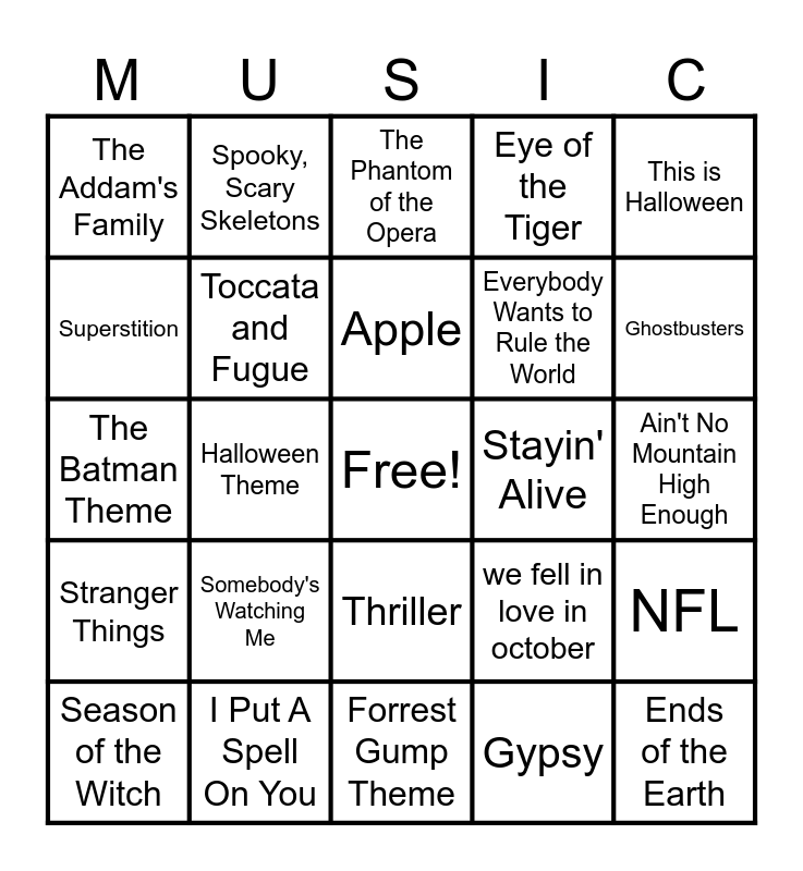 This bingo card has a free space and 30 words: I Put A Spell On You, Loompa Land, Halloween Theme, Hedwig's Theme, The Addam's Family, The Phantom of the Opera, Toccata and Fugue, Thriller, Stayin' Alive, Forrest Gump Theme, Ain't No Mountain High Enough, Ends of the Earth, Gypsy, September, Ghostbusters, Jump in the Line, we fell in love in october, Stranger Things, Somebody's Watching Me, This is Halloween, The Batman Theme, Mr. Blue Sky, Spooky, Scary Skeletons, Everybody Wants to Rule the World, Superstition, Eye of the Tiger, NFL, Season of the Witch, Apple and Wake Me Up When September Ends.