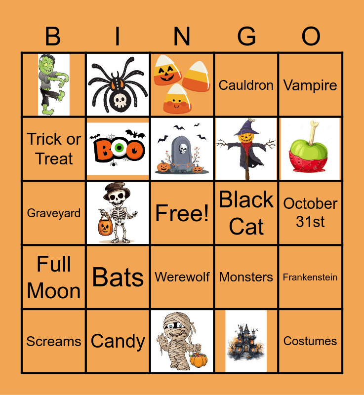 This bingo card has 12 images, a free space and 17 words: Screams, Spooky, Witches, Bats, Black Cat, Candy, October 31st, Costumes, Werewolf, Full Moon, Vampire, Graveyard, Monsters, Trick or Treat, Cauldron, Frankenstein and Happy Halloween.