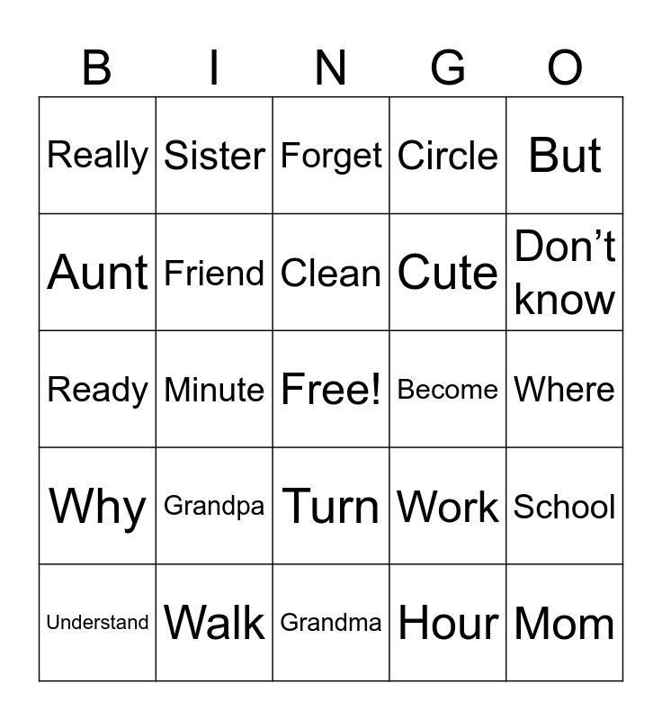 This bingo card has a free space and 52 words: Family, Mom, Dad, Grandma, Grandpa, Brother, Sister, Baby, Aunt, Uncle, Friend, Home, School, Work, Store, Nice, Clean, Become, Different, But, Minute, Hour, Really, Cute, Funny, No, Yes/can, Know, Don’t know, Have, Star, Circle, Triangle, Birthday, Remember, Forget, Walk, Run, Who, What, When, Where, Why, How, Turn, Name, Meet, Ready, Word, Question, Understand and Favorite.