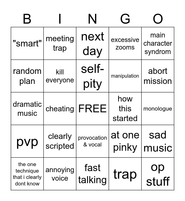 This bingo card has a free space and 24 words: clearly scripted, annoying voice, self-pity, the one technique that i clearly dont know, main character syndrom, "smart", random plan, meeting trap, how this started, provocation & vocal, manipulation, dramatic music, at one pinky, sad music, kill everyone, trap, monologue, next day, abort mission, cheating, op stuff, pvp, excessive zooms and fast talking.