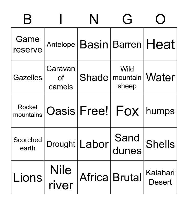 This bingo card has a free space and 31 words: Africa, Sahara Desert, Oasis, Salt flat radiate, Game reserve, Basin, Caravan of camels, Sand dunes, Fox, Brutal, humps, Kalahari Desert, The San People, Bushmen, Water, Ostrich eggs, Shells, Drought, Scorched earth, Labor, Heat, Thirstland, Lions, Antelope, Wild mountain sheep, Gazelles, Barren, Rocket mountains, Nile river, Shade and 25 gallons of water.