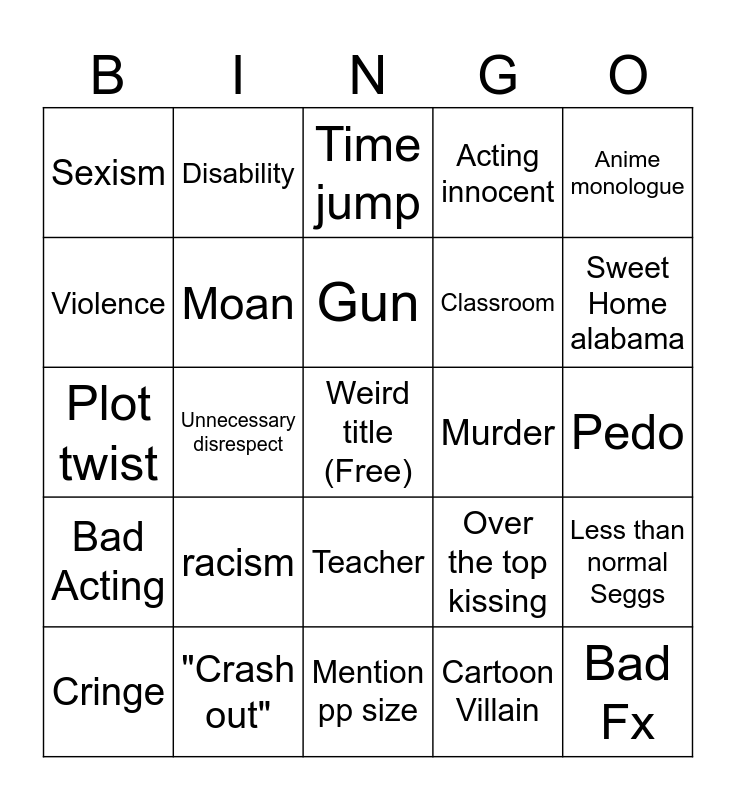 This bingo card has a free space and 24 words: racism, "Crash out", Gun, Cringe, Anime monologue, Sexism, Violence, Disability, Murder, Teacher, Classroom, Plot twist, Over the top kissing, Less than normal Seggs, Moan, Cartoon Villain, Pedo, Time jump, Sweet Home alabama, Unnecessary disrespect, Bad Fx, Bad Acting, Acting innocent and Mention pp size.