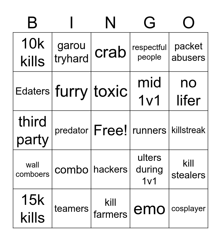 This bingo card has a free space and 24 words: combo, teamers, toxic, 15k kills, packet abusers, 10k kills, Edaters, garou tryhard, runners, hackers, mid 1v1, third party, ulters during 1v1, kill stealers, furry, emo, killstreak, crab, no lifer, predator, cosplayer, wall comboers, respectful people and kill farmers.