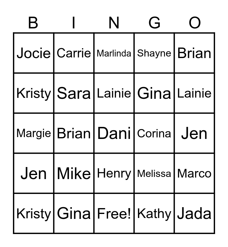 This bingo card has 25 words: Jen, Gina, Dani, Kathy, Brian, Jocie, Carrie, Marlinda, Corina, Marco, Kristy, Sara, Free!, Melissa, Lainie, Kristy, Brian, Lainie, Gina, Jen, Margie, Mike, Henry, Shayne and Jada.