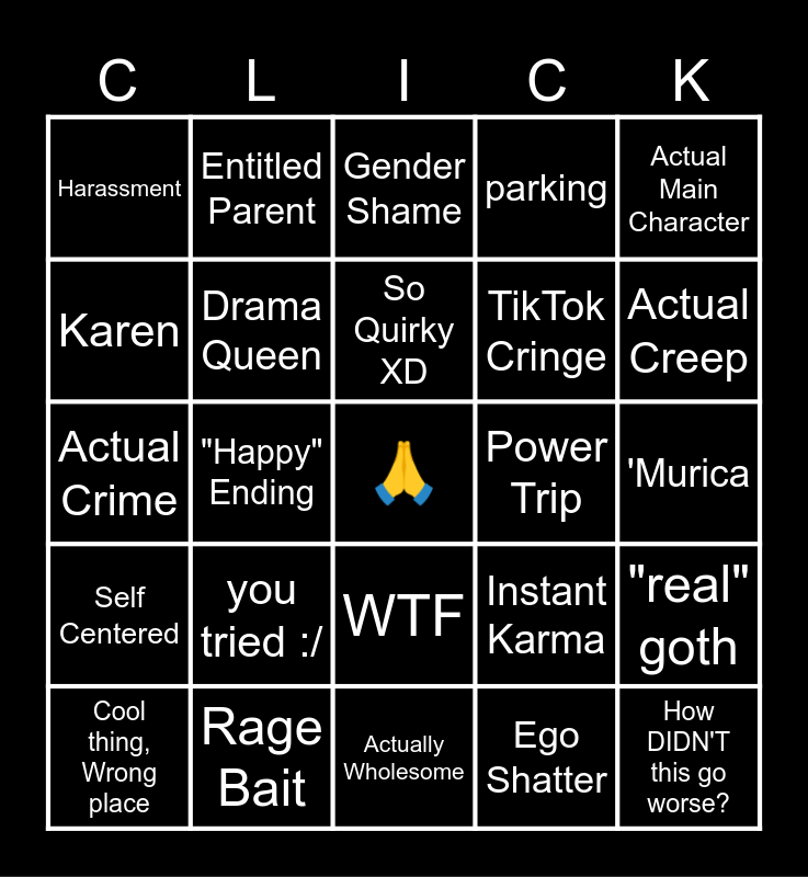 This bingo card has a free space and 24 words: you tried :/, Rage Bait, So Quirky XD, Cool thing, Wrong place, Actual Main Character, Harassment, Karen, Entitled Parent, Power Trip, WTF, TikTok Cringe, Actual Crime, Instant Karma, "real" goth, Drama Queen, Ego Shatter, 'Murica, Gender Shame, Actual Creep, "Happy" Ending, How DIDN'T this go worse?, Self Centered, parking and Actually Wholesome.