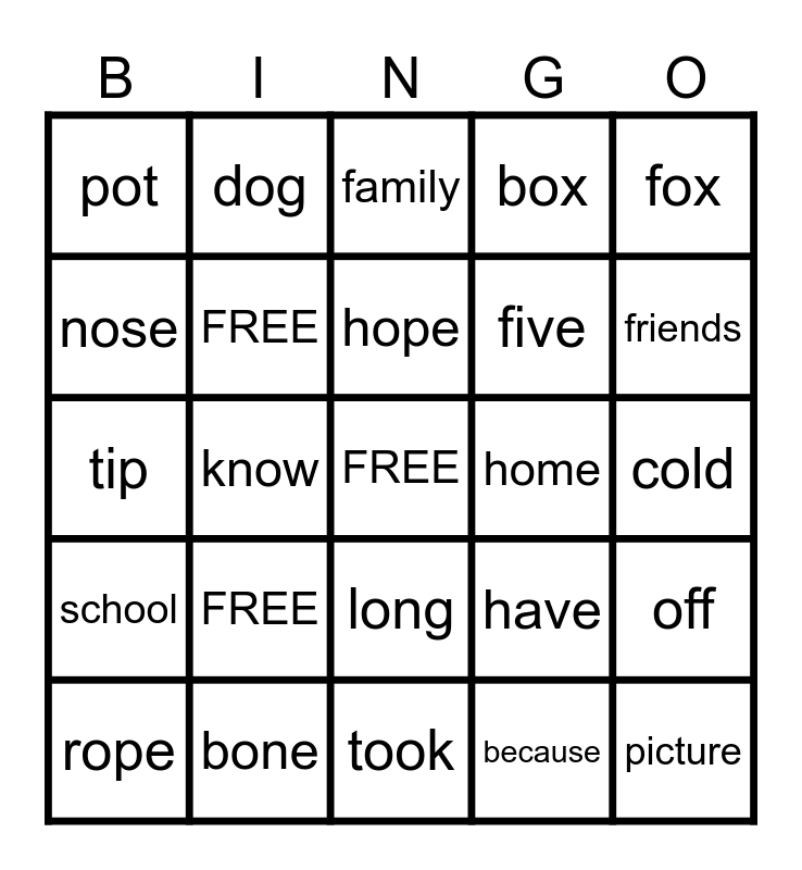 This bingo card has a free space and 24 words: FREE, bone, hope, rope, fox, pot, nose, dog, home, long, five, tip, have, off, FREE, because, cold, family, friends, know, picture, school, box and took.