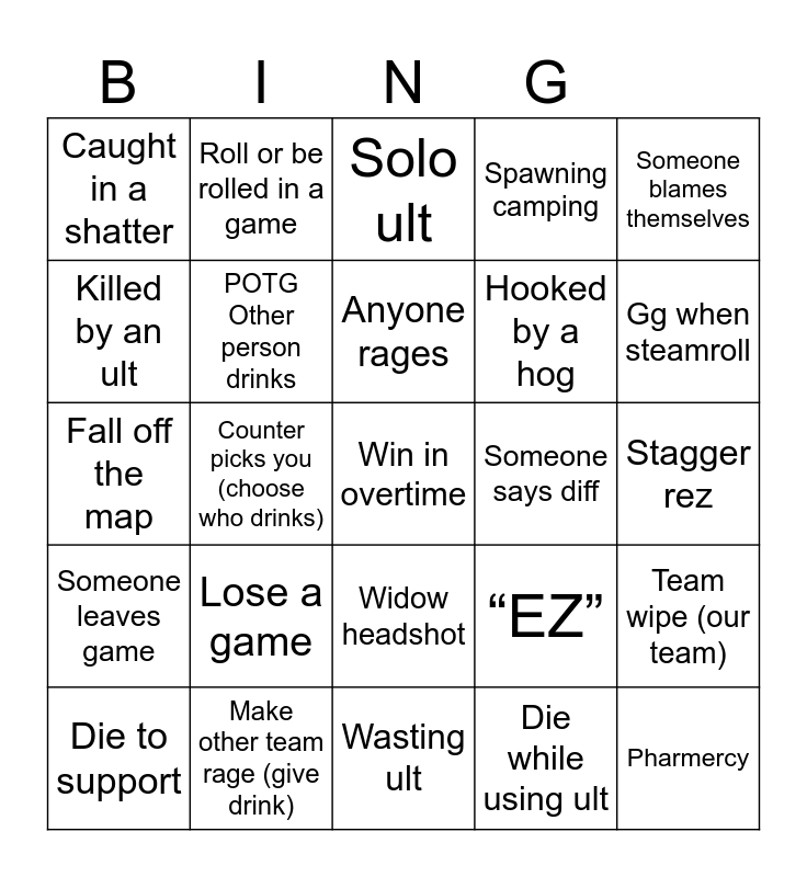 This bingo card has 25 words: Lose a game, Wasting ult, Anyone rages, Die to support, Someone blames themselves, Caught in a shatter, Killed by an ult, Roll or be rolled in a game, Someone says diff, Widow headshot, Hooked by a hog, Fall off the map, “EZ”, Team wipe (our team), POTG Other person drinks, Pharmercy, Stagger rez, Solo ult, Gg when steamroll, Counter picks you (choose who drinks), Win in overtime, Make other team rage (give drink), Someone leaves game, Spawning camping and Die while using ult.