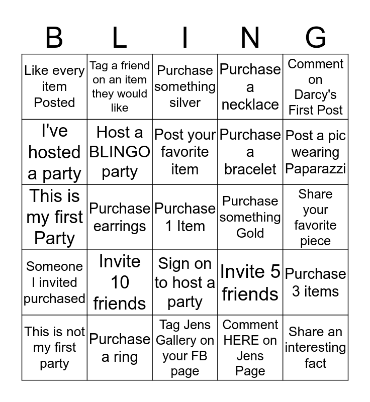 This bingo card has a free space and 24 words: Invite 10 friends, Purchase a ring, Post your favorite item, This is not my first party, Comment on Darcy's First Post, Like every item Posted, I've hosted a party, Tag a friend on an item they would like, Purchase something Gold, Sign on to host a party, Purchase a bracelet, This is my first Party, Invite 5 friends, Purchase 3 items, Host a BLINGO party, Comment HERE on Jens Page, Share your favorite piece, Purchase something silver, Post a pic wearing Paparazzi, Purchase earrings, Share an interesting fact, Someone I invited purchased, Purchase a necklace and Tag Jens Gallery on your FB page.