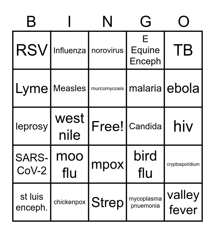 This bingo card has a free space and 25 words: SARS-CoV-2, chickenpox, Strep, mycoplasma pnuemonia, TB, RSV, Influenza, norovirus, Candida, cryptosporidium, Lyme, Measles, white lung disease, bird flu, ebola, st luis enceph., west nile, murcomycosis, malaria, hiv, leprosy, moo flu, mpox, E Equine Enceph and valley fever.
