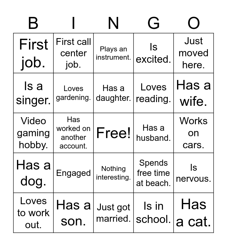 This bingo card has a free space and 26 words: Has a dog., Has a son., Has a daughter., Is in school., Just moved here., First job., Loves gardening., Plays an instrument., Loves reading., Has a cat., Is a singer., Has worked on another account., Loves Disney., Spends free time at beach., Works on cars., Goes fishing., First call center job., Nothing interesting., Is excited., Is nervous., Video gaming hobby., Engaged, Just got married., Has a husband., Has a wife. and Loves to work out..