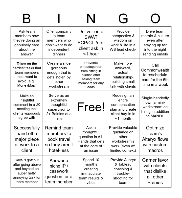 This bingo card has a free space and 24 words: Remind team members to book travel so they aren't hotel-less, Answer a niche IP / casework question for a team member, Prevents ombudsperson from sitting in silence after asking team members for any adds, Says "I gotchu" after going above and beyond on super hefty annoying task for team member, Drive team morale & culture even after staying up far into the night sending emails, Ask team members how they're doing an genuinely care about the answer, Takes on the hardest tasks that team members most want to avoid (e.g., MoneyMap), Offer company to team members who don't want to do independent dinners, Redesign an entire compensation plan and create client buy-in in ~1 month, Ask a thoughtful question in All-Hands that gets at the core of an issue, Make non-awkward, actual relationship-building small talk with clients, Make an insightful comment in a JK meeting that clients vigorously agree with, Provide valuable guidance on other workstream's work (even w/ limited context), Optimize team's Alteryx flows with custom macros, Create a slide gorgeous enough that is gets stolen by other workstream, Provide Alteryx & Tableau coaching & trouble-shooting for team, Single-handedly own a mini-workstream on hiring in addition to MANDL, Deliver on a SWAT SCP/CLI/etc. client ask in <1 hour, Call Commonwealth to reschedule cars for the 6th time in a week, Serve as an extremely thoughtful supervisor to 2+ Bainies at a time, Garner favor with clients that dislike all other Bainies, Successfully hand off a major piece of work to a client, Provide perspective & wisdom on work & life in a WS lead check-in and Spend 10 months creating immaculate team results & vibes.