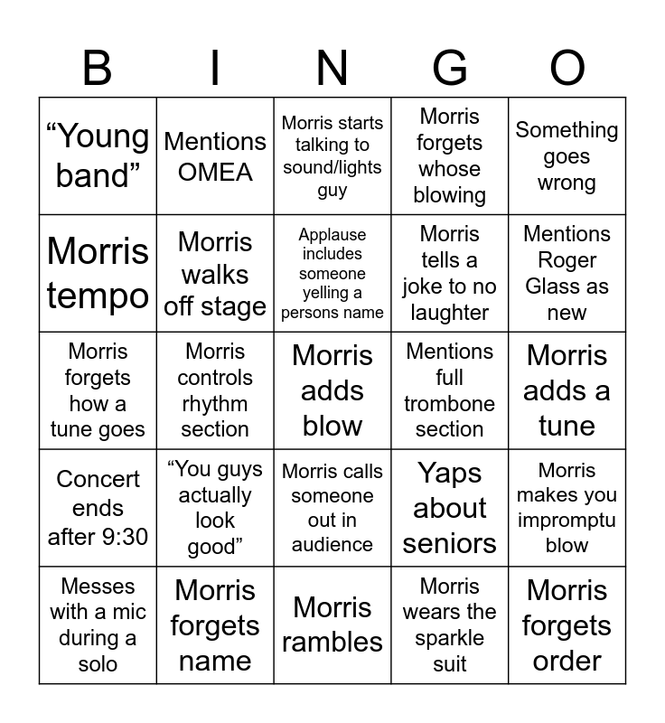 This bingo card has 30 words: Morris forgets name, Morris dances with mom, Morris controls rhythm section, Morris says something out of pocket, “Young band”, Morris starts talking to sound/lights guy, Morris walks off stage, Morris calls someone out in audience, Mentions full trombone section, Morris rambles, Morris adds a tune, Morris adds blow, Morris wears the sparkle suit, Morris forgets order, Mentions Roger Glass as new, Morris forgets his new count off rule, Yaps about seniors, Concert ends after 9:30, “You guys actually look good”, Something goes wrong, Morris forgets how a tune goes, Heart and soul takes over 7 minutes, Mentions OMEA, Morris tells a joke to no laughter, Morris tempo, Morris forgets whose blowing, Morris makes you impromptu blow, Messes with a mic during a solo, Applause includes someone yelling a persons name and “I’ll need a drink after this”.