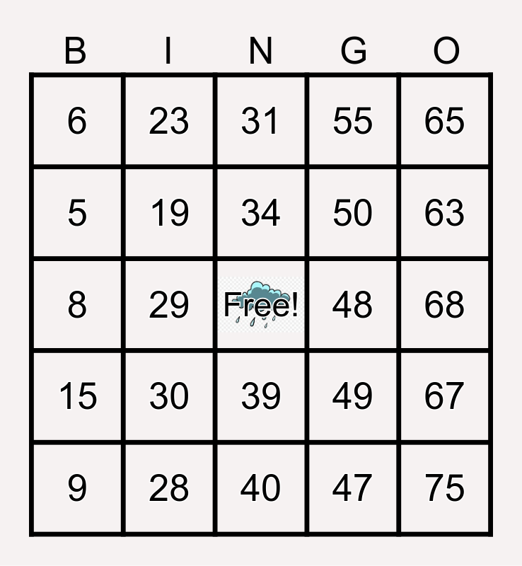 This bingo card has a free space and 75 words: 1, 16, 31, 46, 61, 2, 17, 32, 47, 62, 3, 18, 48, 63, 4, 19, 33, 49, 64, 5, 20, 34, 50, 65, 6, 21, 35, 51, 66, 7, 22, 36, 52, 67, 8, 23, 37, 53, 68, 9, 24, 38, 54, 69, 10, 25, 39, 55, 70, 11, 26, 40, 56, 71, 12, 27, 41, 57, 72, 13, 28, 42, 58, 73, 14, 29, 43, 59, 74, 15, 30, 44, 60, 75 and 45.