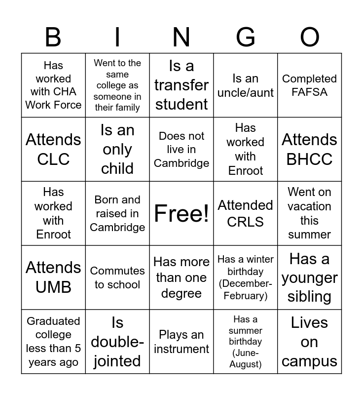 This bingo card has a free space and 24 words: Commutes to school, Is double-jointed, Does not live in Cambridge, Graduated college less than 5 years ago, Completed FAFSA, Has worked with CHA Work Force, Attends CLC, Went to the same college as someone in their family, Attended CRLS, Has more than one degree, Has worked with Enroot, Has worked with Enroot, Has a winter birthday (December-February), Has a younger sibling, Is an only child, Has a summer birthday (June-August), Went on vacation this summer, Is a transfer student, Attends BHCC, Born and raised in Cambridge, Lives on campus, Attends UMB, Is an uncle/aunt and Plays an instrument.