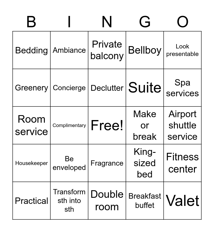 This bingo card has a free space and 24 words: Be enveloped, Transform sth into sth, Declutter, Practical, Look presentable, Bedding, Greenery, Ambiance, Make or break, Fragrance, Suite, Room service, King-sized bed, Fitness center, Concierge, Breakfast buffet, Airport shuttle service, Private balcony, Spa services, Complimentary, Valet, Housekeeper, Bellboy and Double room.