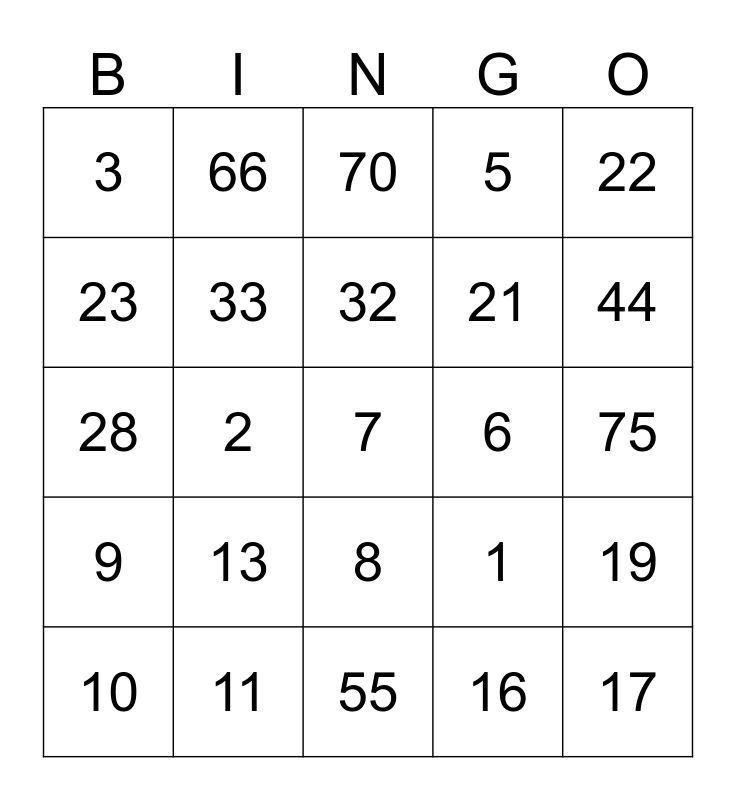 This bingo card has 25 words: 13, 55, 32, 10, 22, 3, 23, 66, 6, 8, 21, 28, 1, 19, 33, 17, 75, 70, 44, 2, 7, 11, 9, 5 and 16.