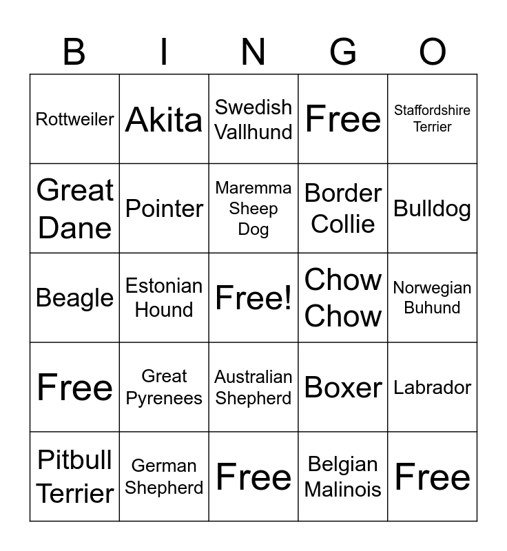 This bingo card has a free space and 24 words: Great Pyrenees, German Shepherd, Maremma Sheep Dog, Pitbull Terrier, Staffordshire Terrier, Rottweiler, Great Dane, Akita, Chow Chow, Australian Shepherd, Border Collie, Beagle, Boxer, Labrador, Pointer, Belgian Malinois, Norwegian Buhund, Swedish Vallhund, Bulldog, Estonian Hound, Free, Free, Free and Free.