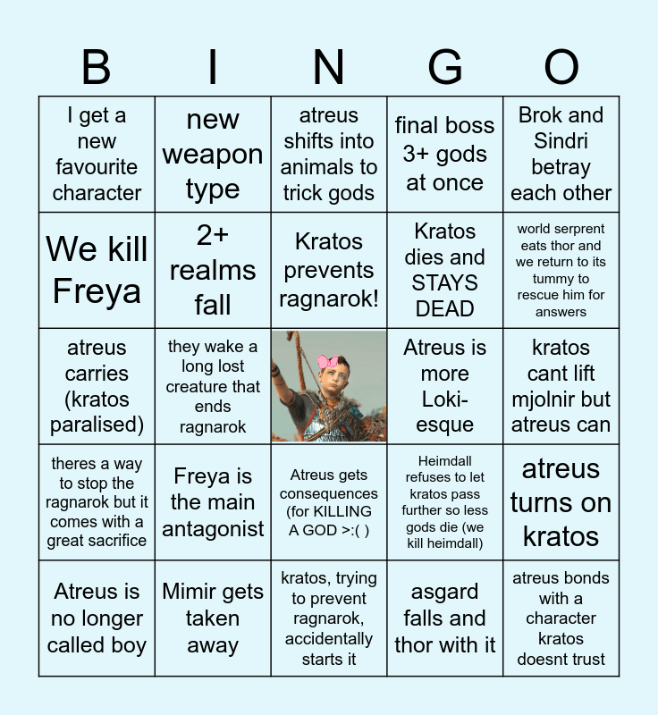 This bingo card has a free space and 24 words: Freya is the main antagonist, Mimir gets taken away, Kratos prevents ragnarok!, Atreus is no longer called boy, Brok and Sindri betray each other, I get a new favourite character, We kill Freya, new weapon type, Atreus is more Loki-esque, Atreus gets consequences (for KILLING A GOD >:( ), Kratos dies and STAYS DEAD, atreus carries (kratos paralised), Heimdall refuses to let kratos pass further so less gods die (we kill heimdall), atreus turns on kratos, 2+ realms fall, asgard falls and thor with it, kratos cant lift mjolnir but atreus can, atreus shifts into animals to trick gods, world serprent eats thor and we return to its tummy to rescue him for answers, they wake a long lost creature that ends ragnarok, atreus bonds with a character kratos doesnt trust, theres a way to stop the ragnarok but it comes with a great sacrifice, final boss 3+ gods at once and kratos, trying to prevent ragnarok, accidentally starts it.