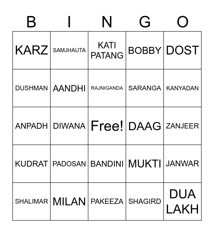 This bingo card has a free space and 73 words: ANAND, SARGAM, KARZ, AASHA, QURBANI, SUHAAG, KUDRAT, NOORIE, MUKTI, SANYASI, SHOLAY, JULIE, AANDHI, ZANJEER, ANAMIKA, SAMJHAUTA, PAKEEZA, DUSHMAN, ANURAG, DAAG, RAJNIGANDA, BOBBY, DOST, APNAPAN, SHALIMAR, TRISHUL, KINARA, ANURODH, CHITCHOR, AARZOO, MILAN, SURAJ, GUIDE, DON, DIWANA, ANUPAMA, CHHALIA, ANITA, DUA LAKH, HUMDONO, SHAGIRD, PADOSAN, HUMRAAZ, BHRAMCHARI, SASURAL, SARANGA, KATI PATANG, GHARANA, AARTI, ANPADH, JUNGLEE, ANDAZ, GUMRAH, PROFESSOR, PARASMANI, HUMRAHI, AANKHEN, BANDINI, VISHWAS, SANGAM, SUNGHURSH, SAHELI, INTEQAM, KANYADAN, KHANDAN, SHIKAR, KHILONA, RAJKUMAR, JANWAR, WAQT, PEHCHAN, SHARAFAT and YAADGAR.
