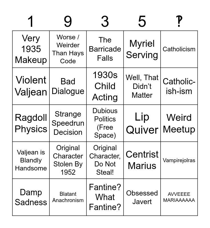 This bingo card has a free space and 32 words: Obsessed Javert, Hays Code Hollywood, Strange Speedrun Decision, Valjean has a certain je ne sais Wrung Out Towel, Valjean is Blandly Handsome, Bad Dialogue, Catholicism, Vampirejolras, Worse / Weirder Than Hays Code, Éponine Dies, 1930s Child Acting, The Barricade Falls, Terrible Implications about Valjean and Cosette, Influenced (Derogatory) Other Adaptations, Lip Quiver, Quivering, Damp Sadness, Ragdoll Physics, Original Character, Do Not Steal!, Original Character Stolen By 1952, Centrist Marius, Hugo Did Not Say That, Weird Meetup, Blatant Anachronism, AVVEEEE MARIAAAAAA, Myriel Serving, Well, That Didn’t Matter, Violent Valjean, Very 1935 Makeup, Fantine? What Fantine?, Radical Centrist Moderation and Catholic-ish-ism.