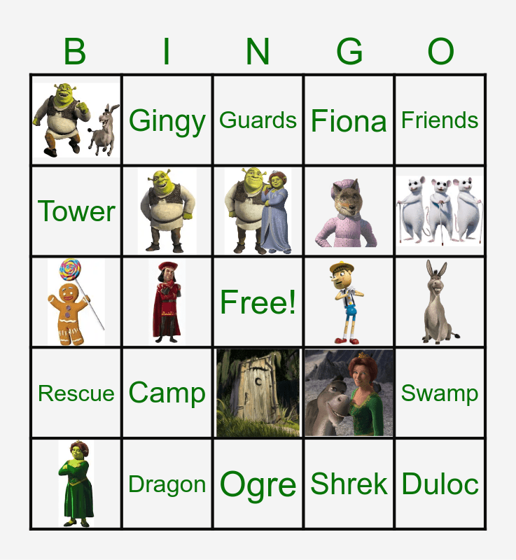 This bingo card has 19 images, a free space and 15 words: Donkey, Tower, Ogre, Duloc, Gingy, Shrek, Rescue, Swamp, Dragon, Fiona, Princess, Camp, Guards, Knight and Friends.