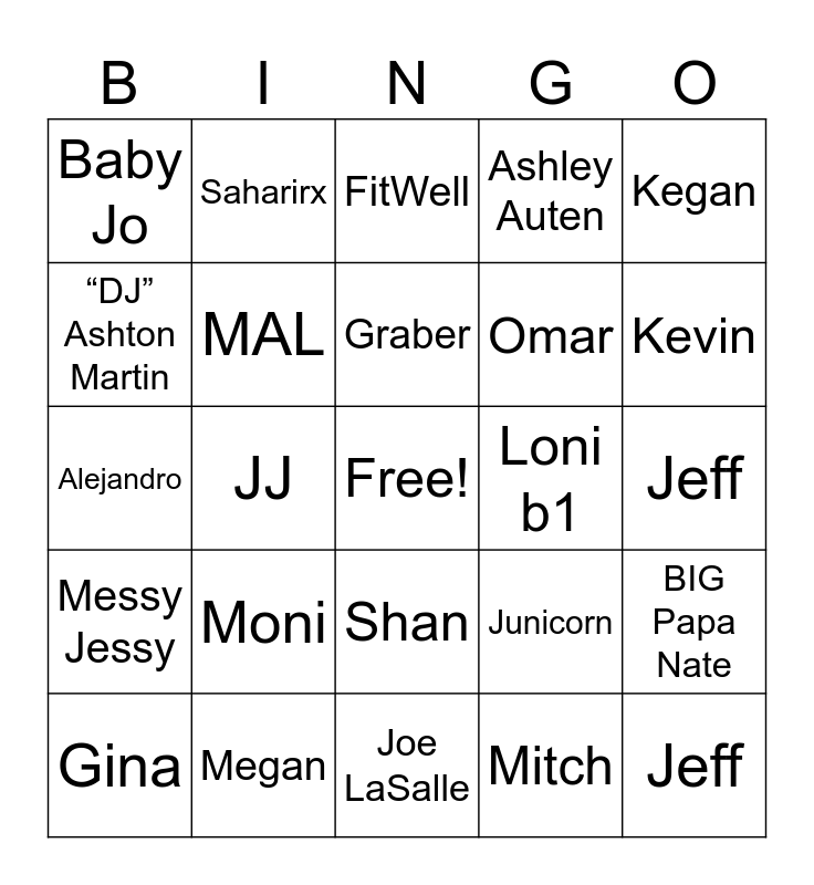 This bingo card has a free space and 24 words: Moni, Megan, Graber, Gina, Kegan, Baby Jo, “DJ” Ashton Martin, Saharirx, Loni b1, Shan, Omar, Alejandro, Junicorn, BIG Papa Nate, MAL, Mitch, Jeff, FitWell, Kevin, JJ, Jeff, Messy Jessy, Ashley Auten and Joe LaSalle.
