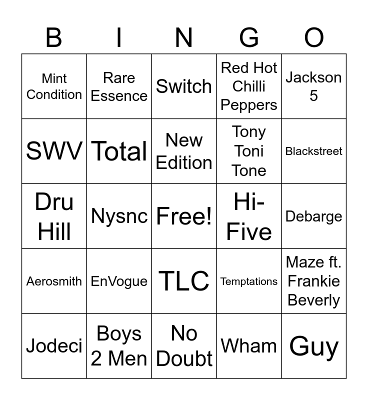 This bingo card has a free space and 24 words: EnVogue, Boys 2 Men, New Edition, Jodeci, Jackson 5, Mint Condition, SWV, Rare Essence, Hi-Five, TLC, Tony Toni Tone, Dru Hill, Temptations, Maze ft. Frankie Beverly, Total, Wham, Debarge, Switch, Blackstreet, Nysnc, Guy, Aerosmith, Red Hot Chilli Peppers and No Doubt.