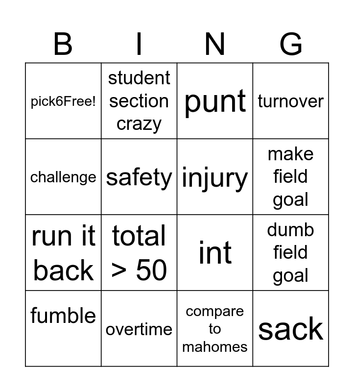 This bingo card has 16 words: fumble, overtime, punt, turnover, challenge, student section crazy, int, dumb field goal, pick6Free!, safety, compare to mahomes, make field goal, run it back, total > 50, injury and sack.