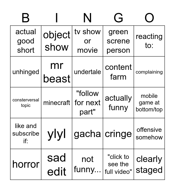 This bingo card has 25 words: ylyl, not funny..., undertale, horror, reacting to:, actual good short, unhinged, object show, actually funny, gacha, content farm, consterversal topic, cringe, offensive somehow, mr beast, clearly staged, mobile game at bottom/top, tv show or movie, complaining, minecraft, "follow for next part", sad edit, like and subscribe if:, green screne person and "click to see the full video".