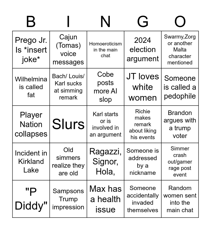 This bingo card has 25 words: Incident in Kirkland Lake, Sampsons Trump impression, Karl starts or is involved in an argument, Someone accidentally invaded themselves, Swarmy,Zorg or another Malta character mentioned, Prego Jr. Is *insert joke*, Cajun (Tomas) voice messages, Homoeroticism in the main chat, Richie makes remark about liking his events, Simmer crash out/gamer rage post event, Wilhelmina is called fat, Bach/ Louis/ Karl sucks at simming remark, Max has a health issue, Someone is addressed by a nickname, Someone is called a pedophile, "P Diddy", Slurs, Cobe posts more AI slop, JT loves white women, Brandon argues with a trump voter, Player Nation collapses, Old simmers realize they are old, Ragazzi, Signor, Hola,, 2024 election argument and Random women sent into the main chat.