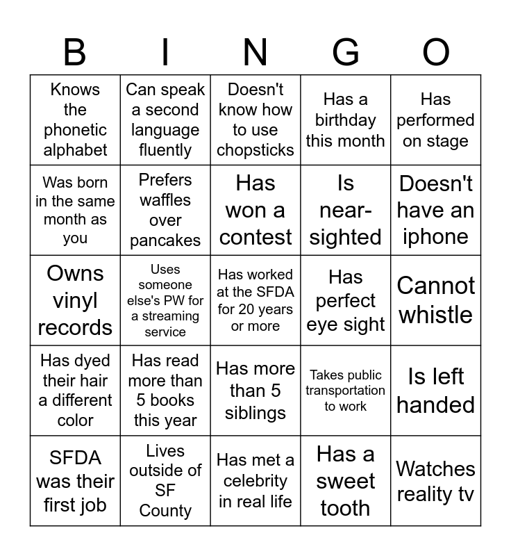 This bingo card has 46 words: Free!, Has worked at the SFDA for 20 years or more, Has traveled to more than 5 countries, Has met a celebrity in real life, Has read more than 5 books this year, Has an unusual collection, Can speak a second language fluently, Is a SF Native, Was born in the same month as you, Has lived in another state, Prefers waffles over pancakes, Has a birthday this month, Is left handed, Takes public transportation to work, Doesn't know how to drive, Doesn't have a middle name, Has won a contest, Has perfect eye sight, Knows how to play musical instrument, Has performed on stage, Uses someone else's PW for a streaming service, Has a sweet tooth, Knows the phonetic alphabet, Is near-sighted, Has worked in retail, Doesn't have an iphone, SFDA was their first job, Was on a dance team, Has more than 5 siblings, Has dyed their hair a different color, Has a pet other than a cat or dog, Doesn't drink coffee, Someone that went to SF State, Someone who studied abroad, Holds up the peace sign when taking pictures, Lives outside of SF County, Cannot whistle, Knows their Zodiac sign, Knows the exact time they were born, Likes pineapple on pizza, Watches reality tv, Doesn't know how to use chopsticks, Owns vinyl records, Has changed a car tire, Picked up a hobby during Covid lockdown and Prefers phone calls over texts.