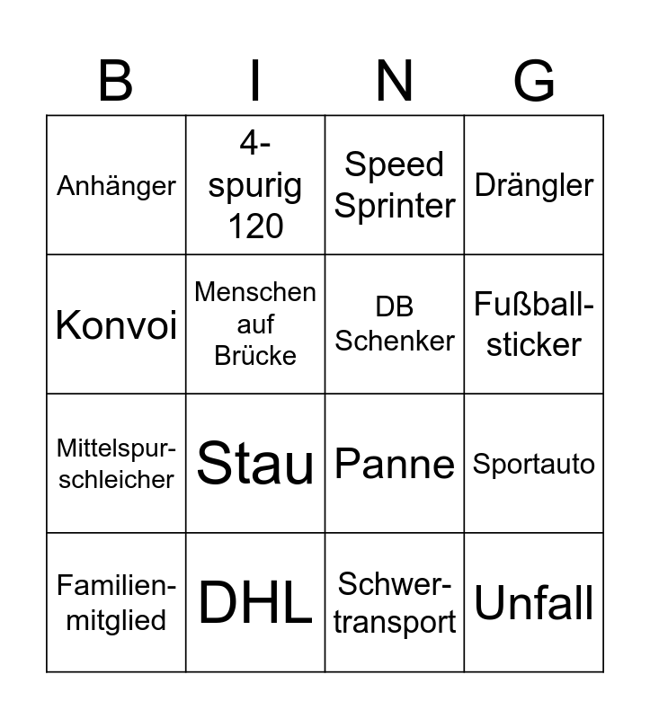 This bingo card has 16 words: DHL, Sportauto, Speed Sprinter, Anhänger, Mittelspur- schleicher, 4-spurig 120, Panne, Schwer- transport, Konvoi, Menschen auf Brücke, Familien- mitglied, Drängler, Stau, Fußball- sticker, DB Schenker and Unfall.