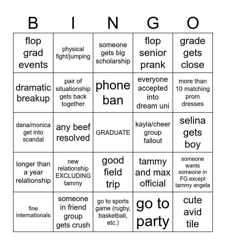 This bingo card has a free space and 24 words: new relationship EXCLUDING tammy, someone in friend group gets crush, phone ban, fine internationals, grade gets close, flop grad events, dramatic breakup, physical fight/jumping, kayla/cheer group fallout, good field trip, everyone accepted into dream uni, dana/monica get into scandal, tammy and max official, someone wants someone in FG except tammy angela, pair of situationship gets back together, go to party, selina gets boy, someone gets big scholarship, more than 10 matching prom dresses, any beef resolved, cute avid tile, longer than a year relationship, flop senior prank and go to sports game (rugby, basketball, etc.).