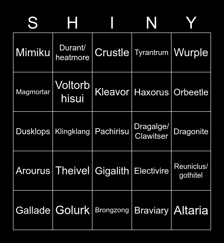 This bingo card has a free space and 24 words: Theivel, Golurk, Kleavor, Gallade, Wurple, Mimiku, Magmortar, Durant/ heatmore, Dragalge/ Clawitser, Gigalith, Haxorus, Dusklops, Electivire, Reuniclus/ gothitel, Voltorb hisui, Braviary, Dragonite, Crustle, Orbeetle, Klingklang, Altaria, Arourus, Tyrantrum and Brongzong.