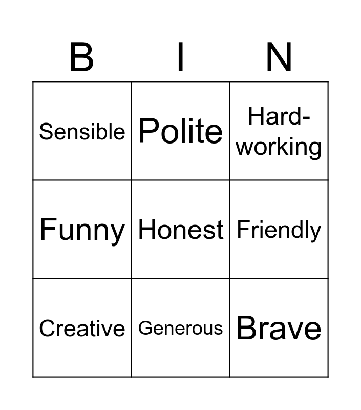 This bingo card has a free space and 8 words: Friendly, Hard-working, Polite, Creative, Sensible, Brave, Funny and Generous.
