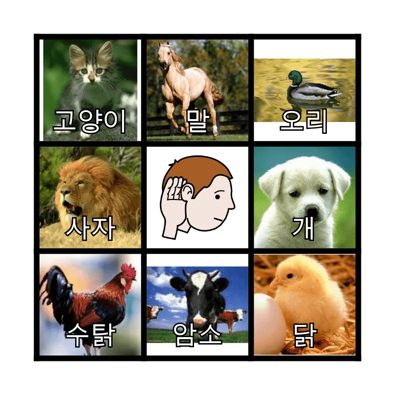 This bingo card has 8 images, a free space and 8 words: 개, 오리, 말, 수탉, 고양이, 닭, 사자 and 암소.